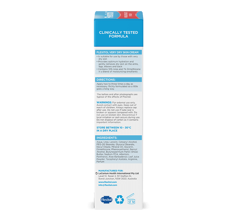 أثبتت التجارب السريرية أن كريم Flexitol للبشرة الجافة جدًا يعمل على زيادة ترطيب البشرة بنسبة 52% في أسبوعين.