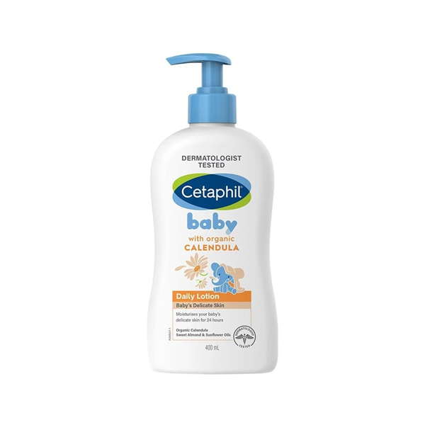 Cetaphil Baby Daily Lotion with Organic Calendula (400ml) is a hypoallergenic, dermatologist-tested formula designed to moisturize and protect sensitive baby skin for 24 hours. Enriched with calendula extract, sunflower oil, and sweet almond oil, this lotion softens and nourishes while shielding against dryness. It is free from parabens, mineral oils, and colorants.