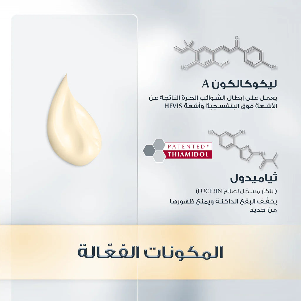 Eucerin Even Pigment Perfector Sun Fluid SPF 50+ is an everyday facial sunscreen for all skin types that helps to prevent sun-induced hyperpigmentation. The Advanced Spectral Technology combines broadband and photostable UVA/UVB filters1 for very high UV protection with Licochalcone A to neutralize free radicals caused by UV and HEVIS light. The anti-pigment sunscreen also includes glycyrrhetinic acid, which supports the skin's own DNA repair mechanism.