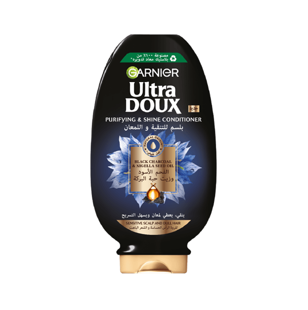 Garnier Ultra Doux Black Charcoal & Nigella Seed Oil conditioner is a real recipe to purify & shine dull hair. Combining Nigella Seed Oil, also known as Black Seed, a precious natural ingredient known to soothe the scalp and restore hair's shine, along with Charcoal, known for its purifying properties, in a creamy texture without weighing down your hair.